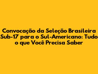 E aí, a convocação da Seleção Brasileira Sub-17 veio com tudo! O técnico, que a gente respeita, reuniu os melhores talentos do país para representar a gente no Sul-Americano. A lista de convocados é sempre um assunto que gera muita discussão, né? A gente analisa, debate, faz as nossas apostas... Mas, no final das contas, o que importa é confiar no trabalho do treinador e apoiar os garotos em busca da vitória. Os jogadores selecionados, em sua maioria, já se destacam em suas equipes, mostrando um futebol de alto nível e muita personalidade. É uma mistura de experiência e juventude, com jogadores que já tiveram a oportunidade de atuar em competições importantes e outros que estão buscando o seu espaço no cenário nacional e internacional. A comissão técnica, com certeza, fez um trabalho minucioso, observando os atletas em ação, analisando suas características e escolhendo aqueles que melhor se encaixam no estilo de jogo da equipe. A expectativa é grande, e a gente espera ver um time forte, competitivo e, acima de tudo, que jogue com raça e determinação, honrando a camisa da Seleção Brasileira. A convocação é um momento de celebração, de esperança e de renovação. É a chance de descobrir novos ídolos, de torcer e vibrar a cada jogo, e de sonhar com a conquista de mais um título para o futebol brasileiro.